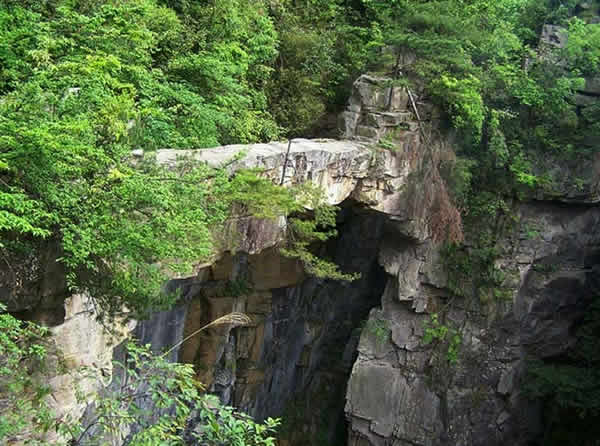 仙人橋又稱天下第一橋,坐落在猴子坡上、天子峰下的王爺洞對面。橋?qū)僮匀恍纬,長26米,寬1.5米,厚一米多,高約六七十 米,飛架在兩岸懸崖絕壁之上,鬼斧神工,惟妙惟肖,古人云:“天地可掬,此真天造也”。仙人橋為紅砂巖結(jié)構(gòu),兩端生有高大的黃山松和杜鵑樹,濃蔭掩映,極其美麗。橋的東頭還有自然形成的石級,人可順石級而下,走上天橋,下視萬丈深淵,令人頭暈目眩,非健壯者不敢逾越,旅游者無不贊嘆,說它是“天下絕景”。