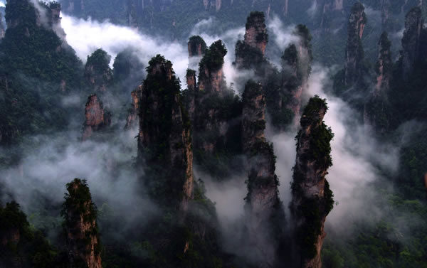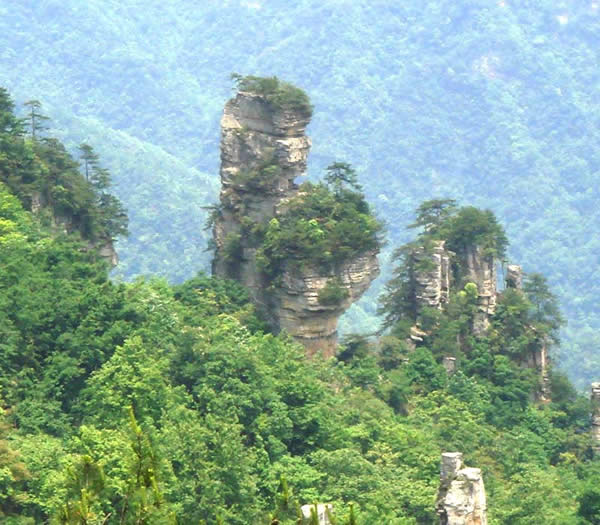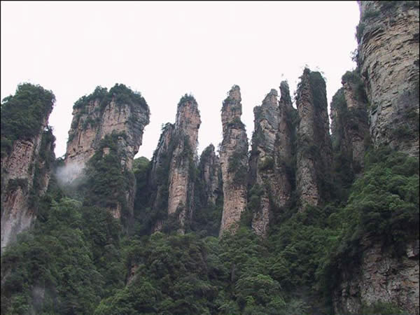從仙人橋去老屋場,但見深谷里密密麻麻羅列上百座石峰,活像一群威武雄壯的將士列隊聽令,相傳這是向王天子的神兵在聚會。神話雖不可靠,但石峰如此集中壯觀,在武陵源也屬罕見。我想引用一位美術大師的話:“豈有此理,莫名其妙,說也不信,到此方知”。不看神兵聚會,怎知石峰成林。