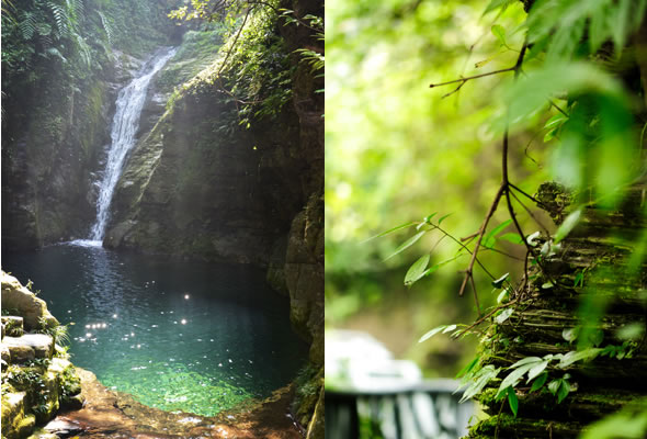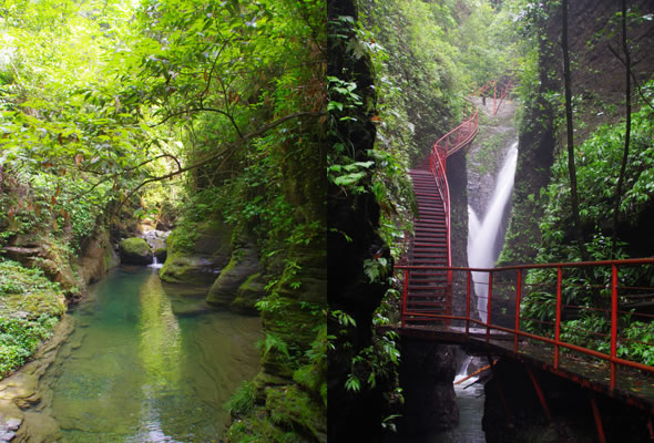 十八潭總名。稍作休憩,我們開始奔赴東線的景點(diǎn)。東線主要是以十八潭為主,下游有4潭:合潭、梳妝潭、魚潭、黑潭;中游有9潭:換衣潭、美人潭、石蛙潭、姊妹潭(3個)、情侶潭(2個)、二龍搶珠,上游有5潭:鬼谷神功(2個)、幽潭、落銀潭(彩虹潭)、路邊潭。十八個潭深淺不一,淺則1米以上,深則4米左右,形狀各異,有的月牙形,有的豬腰狀,形狀不規(guī)則,石壁上水沖成潭,真是鬼谷神功,此處水質(zhì)細(xì)膩,加之綠林映襯,水色碧綠見底,猶如十八顆翡翠石鑲嵌在山林之間,涓涓溪流晶瑩剔透,飛流直下的瀑布,氣勢磅礴,蔚為壯觀, 下游的4潭,合潭、梳妝潭、魚潭、黑潭。合潭是仙女峽谷與十八潭的交匯處;梳妝潭的水清如明鏡,又因為潭兩側(cè)石頭的封閉,使這面鏡子靜止不動,很方便梳妝,照鏡子。在梳妝潭周圍,有一種植物屬于紅豆杉系列,它的形狀好似梳子,可以用來梳頭。魚潭可不能望文生義。魚潭,是在冬天的時候,所有的魚都聚集在這里過冬,除此之外,這個潭水淺見底,冬天魚苗聚集,是捕魚的好季節(jié)。黑潭,水深不見底,所以叫黑潭,F(xiàn)在已經(jīng)看不見梳妝潭、魚潭、黑潭了,你猜為什么?建水庫,建水上樂園,淹沒了。 斷魂石的傳說。三國時期,高氏和蕭氏一對夫妻春節(jié)忙活,遇上了天門垮眼,受余震襲擊,打死了丈夫蕭氏。高氏思念丈夫,淚哭不斷,結(jié)果摔死潭中。人們經(jīng)常還能聽到哭聲傳來,不敢單獨(dú)行走,需成群結(jié)隊。后人為了鎮(zhèn)邪,雕刻一條蜈蚣驅(qū)趕哭魂,多年后,蜈蚣成精,天上打雷,巖石發(fā)光,遭雷所劈,成了斷魂石。 和尚姥,也就是丹灶峰,天門十六峰之一。相傳此峰為仙人化身,赤松子曾在此煉丹,許多詩人在此留下了美妙的詩篇,明代葉守禮《丹灶峰》: 懸崖峭壁隔塵寰,上有仙人學(xué)煉丹。 煉得丹成鶴已去,獨(dú)留丹灶在峰巒。 意思是說,在這險峻秀麗的山峰上,赤松子潛心煉丹,不受塵世干擾,身心沉醉于秀美的山間,沉溺于丹藥的煉制之中。作者很是羨慕那種與世隔絕的超脫,那種執(zhí)著于自我理想的瀟灑,你羨慕不羨慕? 竹林叢生。我們要學(xué)習(xí)竹子的精神,中空、謙卑;我們要學(xué)習(xí)竹子的精神,抱團(tuán)生長;我們要學(xué)習(xí)竹子的精神,破土而出,節(jié)節(jié)高。 向家塔。打造農(nóng)耕養(yǎng)生游的地方。種田、種菜、種花,農(nóng)家餐館。 爛泥巴根。爛泥巴根和馬桑樹是同科,是這里獨(dú)特的一種樹。馬桑樹亦稱“千年紅”、“馬鞍子”,屬落葉灌木,馬桑樹多枝叢生,一簇一簇的,枝葉像傘蓋,因此“馬桑樹兒搭燈臺”。春風(fēng)一吹,滿山的馬桑樹、爛泥巴根就吐翠滴綠,顯示出強(qiáng)勁的生命力。打油詩一首: 青青枝條四方走, 肥肥大葉落上頭, 身在路邊無人問, 冬去春來樂悠悠。 秋天死亡,春天長勢更加茂盛,它的新生是通過死亡實現(xiàn)的。山川如此,植物也是如此,這里的一草一木無不透露著道家那種齊生死、等貴賤的精神。 這叫“常道”亭,“道可道,非常道”,據(jù)說是白狐與劉海相遇的地方。吊橋。 十八潭各具特色。 中游有9潭。第五潭叫換衣潭。巖石聳立,霧氣氤氳,巖壁上布滿水汽,猶如雨下。又因過道狹窄,行人需彎腰通過,未免雨水打濕衣裳,在此就要脫下身上衣物,通過后在第六潭再穿上。因此第六潭又叫美人潭,很幽深神秘的。第七潭叫石蛙潭,水淺,又比較平穩(wěn)、安全,春天產(chǎn)籽。余音回響,猶如蛙鳴,給人“聽取蛙聲一片”的錯覺。 對面巖壁叫“臘肉鋪”,那條自上而下的溪流叫“酒長流”,客人來了,咱土家人熱情,臘肉下炕,苞谷燒,喝兩口! 第八潭第九潭叫情侶潭,比較隱蔽,他倆靜悄悄地談著情話,我們快走,不要打攪他們。 第十潭、十一潭、十二潭叫姊妹潭。下面那個,水淺淺的,溫溫的,是幺妹潭,中間那個是二哥潭,上面那個是大哥潭。 潭的旁邊有珍稀植物馬蘭花,馬蘭花又名蝴蝶花、蝴蝶蘭,為多年生宿根草本花卉,根莖短粗,肥壯;ù笮缕,花色絢麗,鮮艷奪目。花有藍(lán)、白、黃、雪青等色。花期5-6個月,每次花可開花7-10天,頗耐觀賞。馬蘭花在我國栽培已有2000多年的歷史,目前歐、亞、非3洲均有分布,品種極多,難以計數(shù)。此花按植株高度不同可分3種類型:矮株型僅18-25厘米,中株型高25-70厘米,高株型可高達(dá)120厘米。馬蘭花喜陽光,適栽于背風(fēng)向砂質(zhì)土壤中。 馬蘭開花的童謠。他們?nèi)⒚眯r候情感深厚,常常一起跳皮筋。大家會跳嗎?會唱嗎? 小汽車,滴滴滴,馬蘭開花二十一, 二五六二五七,二八二九三十一, 三五六三五七,三八三九四十一, 四五六四五七,四八四九五十一, 五五六五五七,五八五九六十一 ! 還有紅豆杉,像梳頭的篦子,叫“篦子三尖杉”。還有蘭心草,中草藥,空中飄來蘭花的香氣,山谷中峭壁的蘭花,如芳芳人品善良高雅。蘭花如人品有宜人的香氣,蘭花有撩人的幽香,任何花卉的香氣都不能與蘭花比。這幽香時隱時現(xiàn),時濃時淡,時遠(yuǎn)時近。飄蕩在老道灣山谷中,給人清新和愉快的感受。 蘇轍有詩:“谷深不見蘭生處,追逐微風(fēng)偶得之”。 還有大葉榕、玉葉金花、秋海棠、臘蓮繡球、四字馬蘭、紅楓,秋天來臨,看!漫山紅遍,層林盡染。 聞道亭?鬃釉唬撼劦,夕死可以。意思是說,人生悟到“道”的真諦是多么重要,如果是早上知道的,哪怕晚上去死都是值得的。 第十三潭叫二龍搶珠。兩條瀑布傾