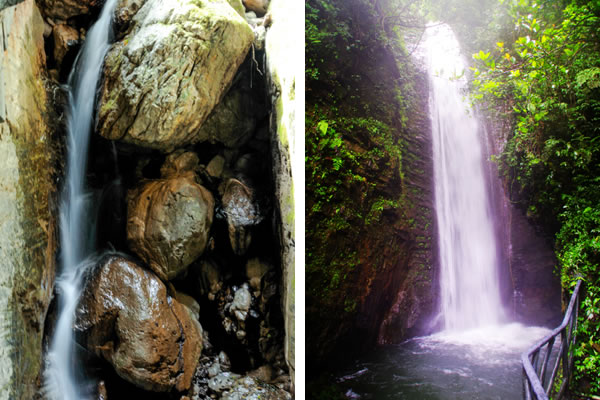 西線原名叫雪花溪,又叫雪花洞,水從懸崖上掉下來濺起水花,泉水與巖石相碰,落成大霧,形成雪花狀,故名雪花溪。因地勢險峻,歷代人都沒有把雪花溪走通過,從下往上看深不見底,古人以為是一個洞,故又叫雪花洞,其實是一個峽谷,有七潭七瀑,現(xiàn)在叫“仙女峽谷”。峽谷長800米,最窄處僅1米左右,上下落差近200米,因水的長期回旋沖刷, 巖層的堅硬度各異,形成了底寬頂窄,時北,時西,時東,陰暗無光,形似溶洞, 泉水飛流直下,形成梯級瀑布,擊打在巖壁上濺起的水花猶如雪花飛舞,潭中一片雪白,古人稱之為雪花洞,峽谷中有七個各異的潭池在沖擊的水花中若隱若現(xiàn),故改稱為七仙女人間沐浴瑤池,從開天辟地起無人行通過,現(xiàn)在已修好的占道,于峽谷水花之中,幻入仙境之感。