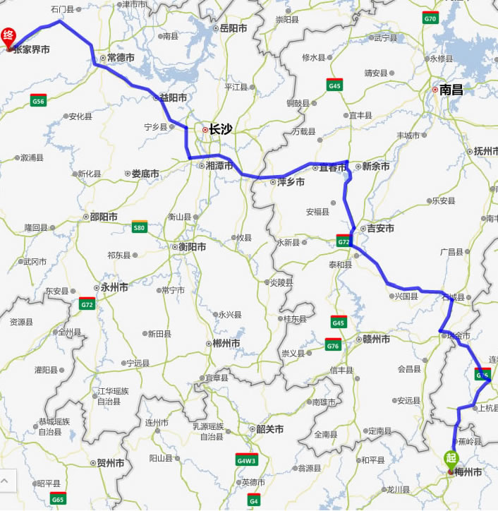 左右,沿途經過梅州——武平縣——瑞金市——寧都縣——吉安市——新余市——宜春市——萍鄉(xiāng)市——湘潭市——寧鄉(xiāng)縣——益陽市——常德市——慈利縣——張家界。